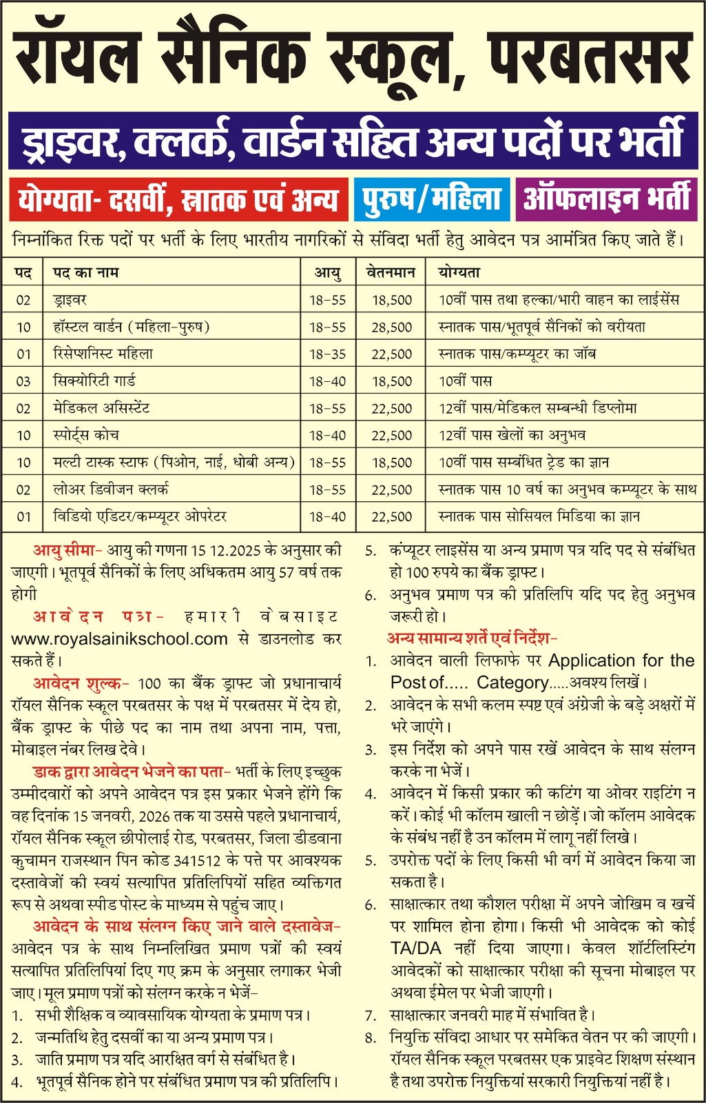 Online applications are invited for classes 3 to 12 from 15 November 2025 to 15 Jan 2026 on the official website of Royal Sainik School Parbatsar "www.royalsainikschool.com" with the prescribed fee of Rs 550.